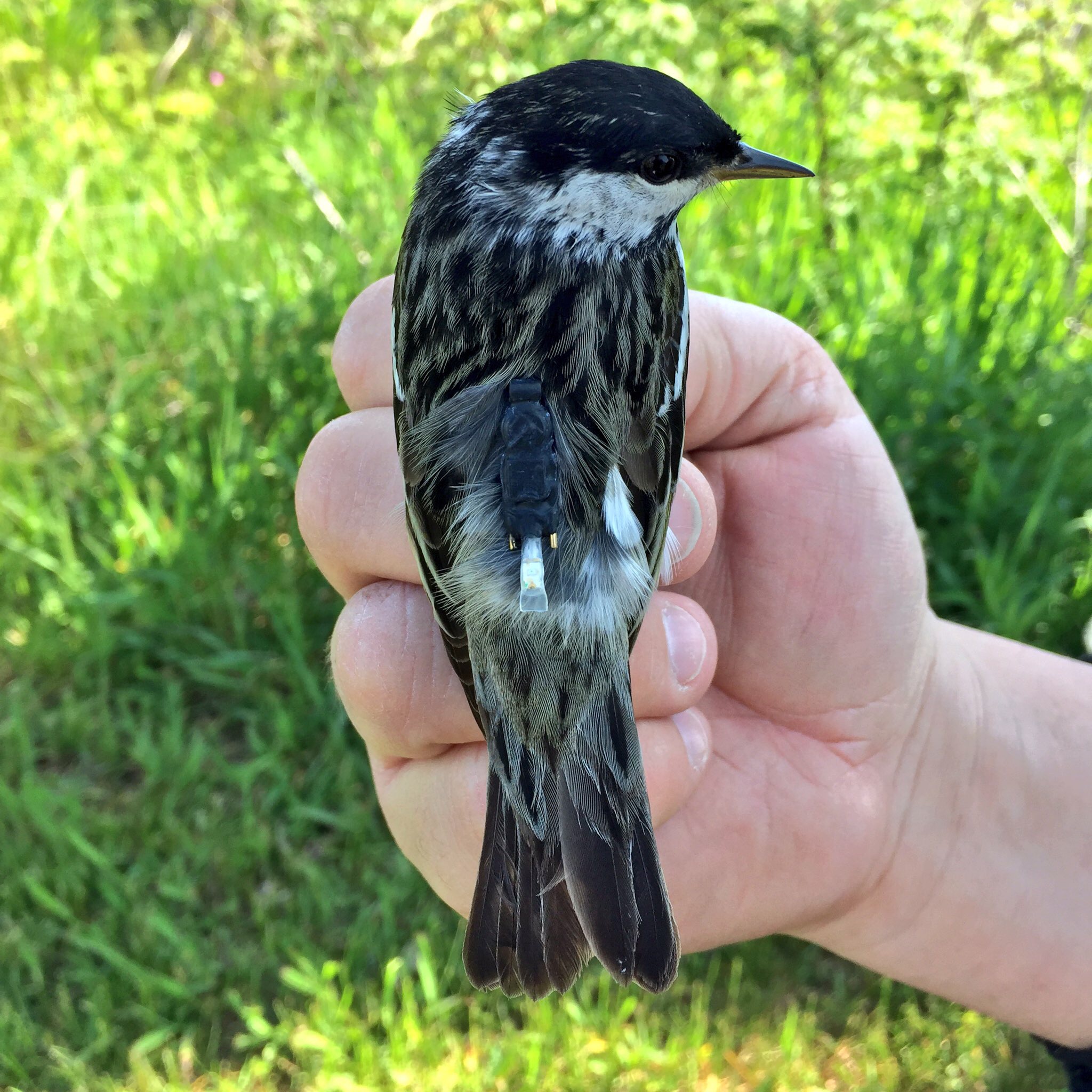 Paruline rayée munie d’un géolocalisateur à Nome, en Alaska. Photo : Stu Mackenzie