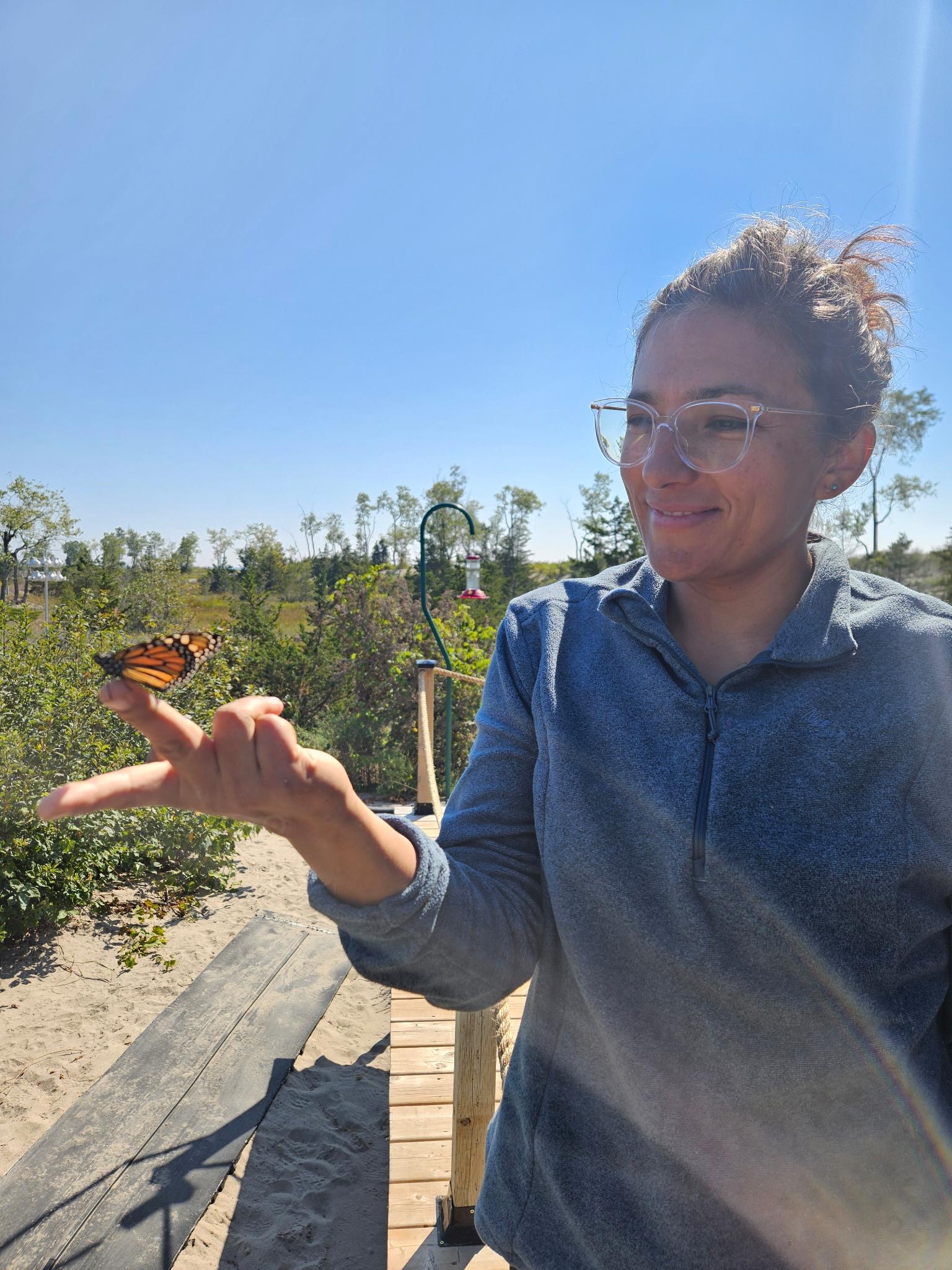 Ana Diaz avec un monarque au Tip de Long Point. Photo : Samuel Perfect.