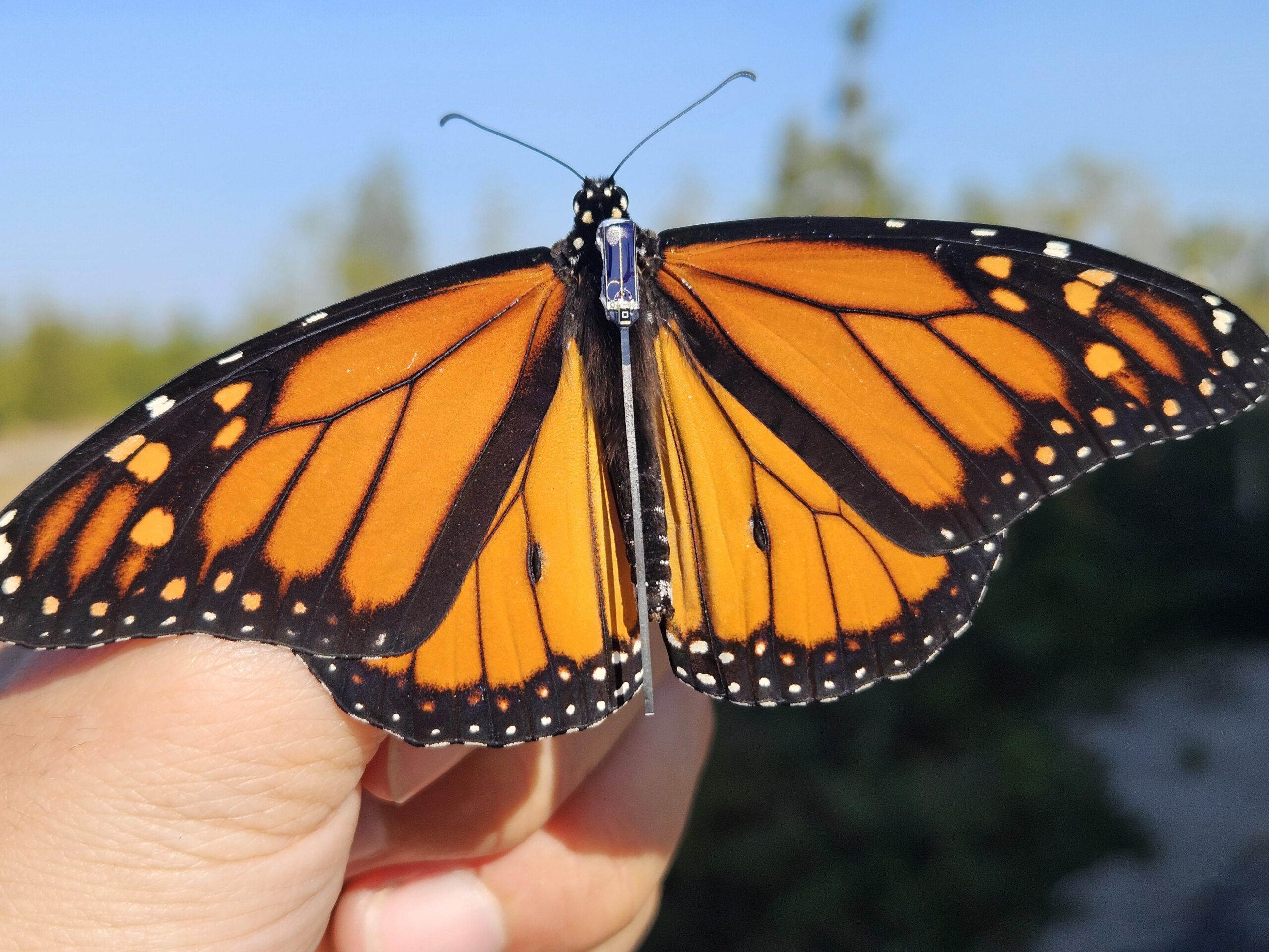 Monarque avec une balise Motus BlūSeries+. Photo : Samuel Perfect.