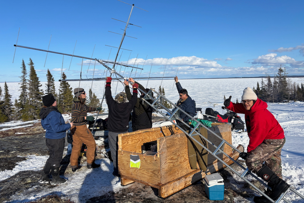 Des membres de la collectivité et du personnel d’Oiseaux Canada travaillent côte à côte dans le froid pour installer une tour qui permettra de suivre des espèces boréales et arctiques qui survolent la région. Cette photo nous montre à quoi ressemble la conservation ici: pratique, communautaire et fondée sur la responsabilité partagée.